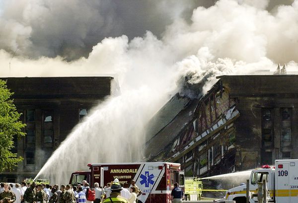 პენტაგონის დასავლეთ შესასვლელთან დაჭრილ ადამიანს სასწრაფო სამედიცინო დახმარების თანამშრომლები მკურნალობენ, მღვდელი კი ლოცვას კითხულობს. პენტაგონის ინციდენტის გამო 125 ადამიანი დაიღუპა, 106 კი სერიოზულად დაშავდა ცეცხლისგან, რომელიც აშშ-ის სამხედრო ეპიცენტრის შენობაზე შეჯახებიდან მალევე გაჩნდა.