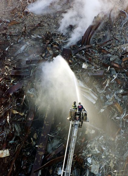 სავაჭრო ცენტრის ჩამოქცევის შემდეგ დარჩენილი ნანგრევები ტერიტორიაზე, რომელიც მოვლენის “ნიშნული ნული” (Ground Zero) გახდა.