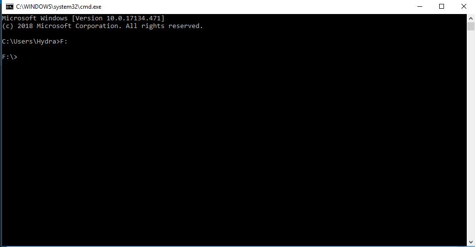 4. როდესაც ჩავრთავ CMD-ს იგი გვიჩვენებს C: დისკს. იმისათვის, რომ მოქმედებები ჩავატაროთ ფლეშ მეხსიერების ბარათზე საჭიროა შევიყვანოთ ჩვენს მიერ დამახსოვრებული ფლეშ მეხსიერების ბარათის ასო და ორი წერტილი. ჩვენ შემთხვევაში F: და დავაწვეთ Enter.