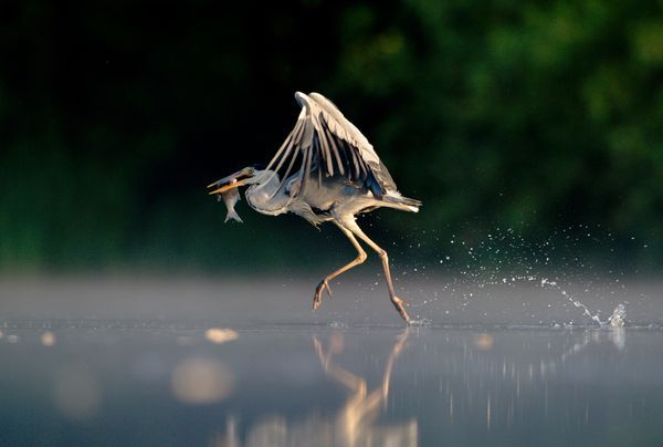 ნაცრისფერი ყანჩა პირში ნადავლით მიაპობს წყალს დერბიშირის ტბაზე