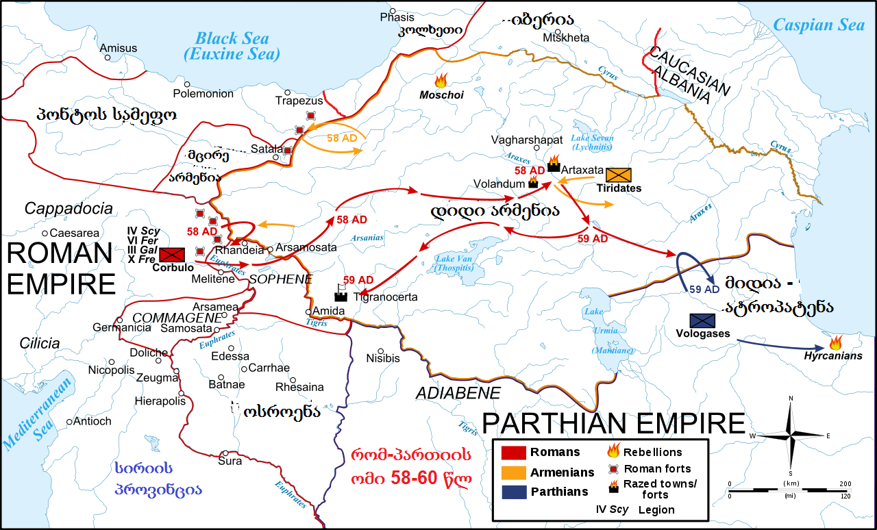51 წელს არმენიელებსა და იბერებს შორის ამტყდარი ომი პართებსა და რომაელებს შორის სასტიკი განხეთქილების მიზეზიც გახდა. პართებზე ვოლოგეზ I (51-78; ვონონ II-ის (51 წ.) ძე, არშაკიდი) ხელმწიფობდა, დედით ბერძენი ხარჭის შვილი, რომელსაც მეფობა ძმების თანხმობით ჰქონდა მიღებული. იბერებზე ფარსმანი მეფობდა ძველთაგანვე, არმენიელები მის ძმას მითრიდატს ეპყრა ჩვენი შეწევნით.