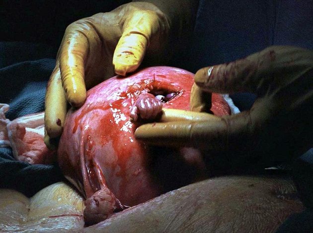 მაიკლ კლენსის 1999 წლის ფოტოზე 21 კვირის ნაყოფი დედის საშვილოსნოდან ხელს ყოფს და ეჭიდება ექიმ ჯოზეფ ბრიუნერს ორსულობამდელი ოპერაციის დროს.…