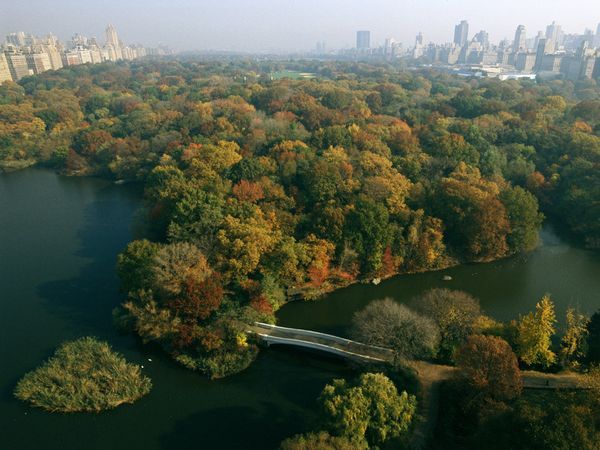 ნიუ-იორკის ცენტრალური პარკის ხედი ზემოდან, პირველი სახალხო პარკი, რომელიც შეერთებულ შტატებში გაიხსნა. მას ყოველწლიურად დაახლოებით 25 მილიონი ადამიანი სტუმრობს, რითაც ერთ-ერთი ყველაზე ხშირად მონახულებადი პარკის სტატუსი აქვს. მისი ფართობია 341 ჰექტარი, სადაც მიედინება 7 მდინარე და გაშენებულია 30 ხიდი და თაღი. ეს ყველაფერი იძლევა სიმშვიდისა და სივრცის შეგრძნებას იმ ქალაქში, რომელსაც არასდროს სძინავს.