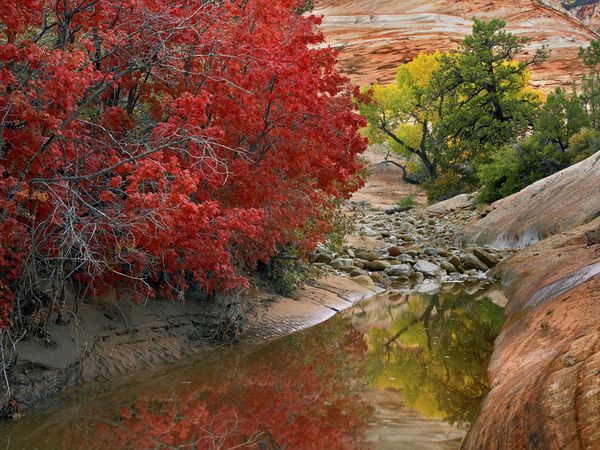 წითელი ნეკერჩხლის ფოთლები და ოქროსფერი ჰიბისკუსი გვამცნობენ, რომ შემოდგომა უკვე მოახლოვდა ქვიშაქვის ვარდისფერ კანიონებში ზიონის ეროვნულ პარკში, იუტას შტატში. ეს ორივე სახეობა აქტიურად მოიხმარს წყალს მაღალი პლატოებისა და ქვის კოშკების მშრალ მიწაზე.